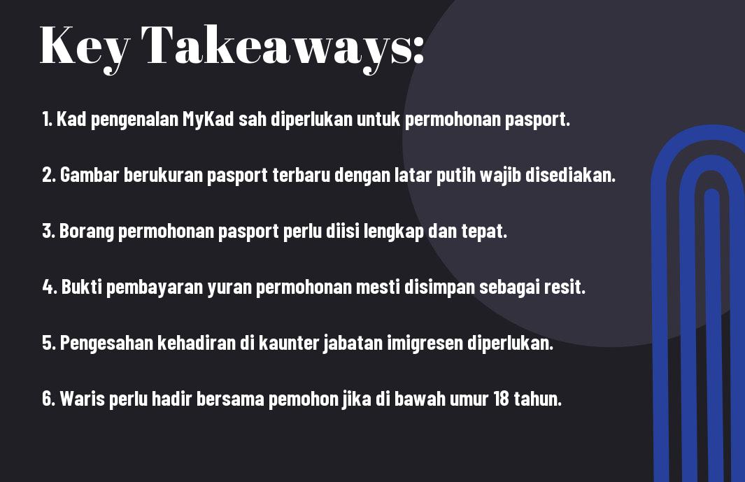Dalam proses permohonan pasport pertama kali, terdapat beberapa dokumen penting yang perlu disediakan agar permohonan anda berjalan lancar. Sebagai contoh, salinan kad pengenalan dan gambar berukuran pasport adalah antara syarat utama yang mesti dipatuhi. Sangat disarankan agar anda memastikan semua dokumen dalam keadaan sempurna, kerana sebarang kesilapan boleh menyebabkan kelewatan dalam mendapatkan pasport. Selain itu, anda juga perlu memahami proses yang terlibat dan mungkin menghadapi beberapa pertanyaan semasa temuduga di pejabat Imigresen. Pengetahuan tentang dokumen yang diperlukan akan memudahkan perjalanan anda dalam mengurus permohonan ini.