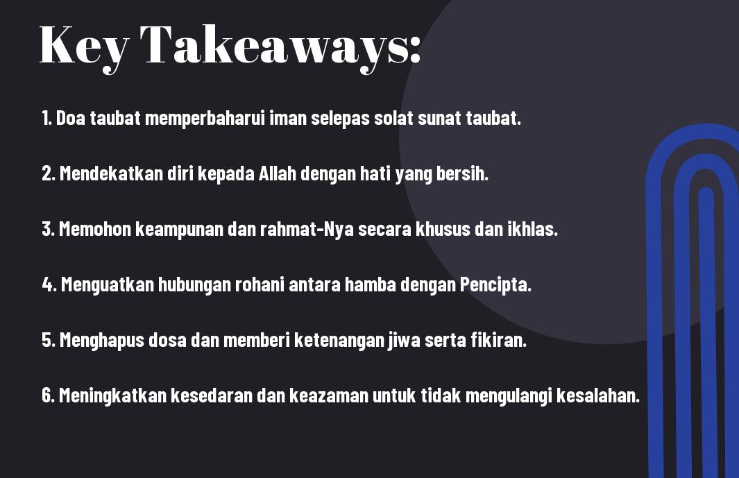 Doa selepas solat sunat taubat memberi impak yang besar dalam proses pembaharuan iman seseorang. Ini kerana melalui Doa Taubat Untuk Diri Sendiri 2025, hati yang gelap dapat diterangi semula dengan cahaya keimanan. Seiring dengan penghayatan doa, jiwa anda akan terasa lebih tenang dan dekat dengan-Nya, mendorong anda untuk memperbaiki diri dan meningkatkan amal soleh.