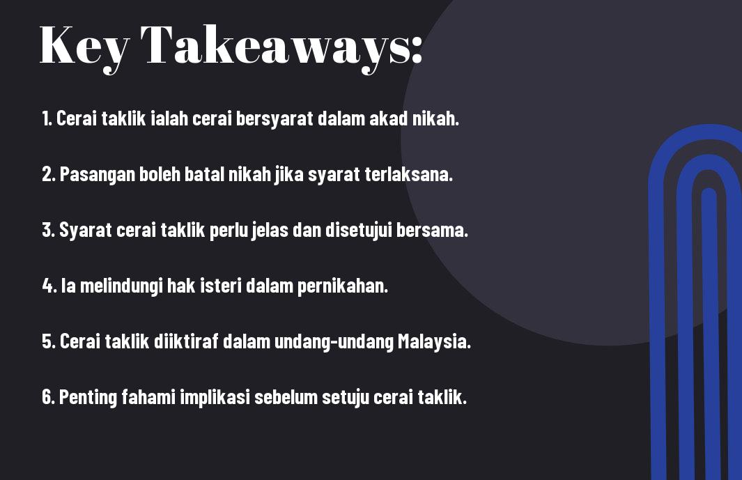 Setelah memahami selok-belok cerai taklik, anda kini lebih berinformasi mengenai implikasi dan prosedurnya. Mengetahui hak dan tanggungjawab anda dalam konteks ini sangat penting, terutamanya bagi pasangan yang ingin mengambil langkah selanjutnya dalam hubungan. Dengan pendekatan yang betul, cerai taklik boleh menjadi jalan penyelesaian yang adil dan berkesan. Selalu ingat, berbincang dengan pakar atau penasihat agama dapat membantu mempertajam pemahaman dan membuat keputusan yang bijak dalam situasi sukar ini.