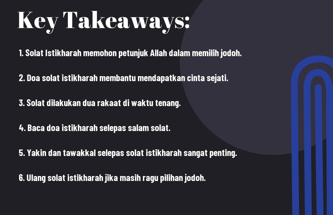 Dalam mencari jodoh, pendekatan spiritual seperti Solat Istikharah mengajarkan anda untuk bertawakkal dan memohon petunjuk Allah. Proses ini bukan sahaja membantu dalam membuat keputusan, tetapi juga mendekatkan diri kepada-Nya. Ketekunan dalam berdoa, disertai dengan niat yang jelas dan hati yang terbuka, adalah kunci untuk mendapatkan jawapan yang diharapkan. Sebagai tambahan, anda boleh merujuk kepada sumber seperti Inilah Panduan Shalat Istikhoroh untuk lebih mendalami teknik dan tata cara yang betul dalam melakukan solat ini. Ingatlah, petunjuk Allah akan datang dengan cara yang tidak terduga, jadi bersabarlah dan teruslah berusaha.