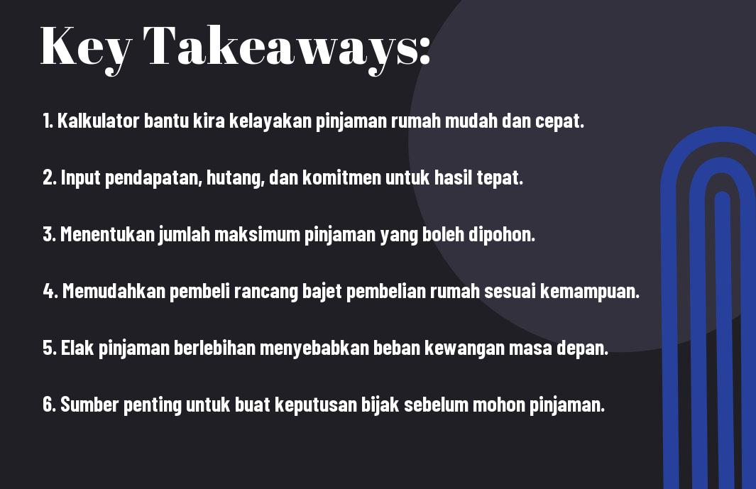 Setelah melalui panduan ini, anda kini lebih berpengetahuan tentang cara menggunakan kalkulator kelayakan pinjaman perumahan. Dengan memahami keperluan dan proses yang terlibat, anda dapat mengelakkan kesilapan yang biasa dibuat oleh pembeli rumah. Pastikan anda memasukkan data yang tepat untuk mendapatkan anggaran yang paling dekat dengan realiti. Dengan merujuk kepada kalkulator ini secara bijak, anda berpeluang untuk mendapatkan pinjaman yang sesuai dengan kemampuan kewangan anda. Ingat, keputusan yang baik adalah hasil daripada persediaan yang menyeluruh.