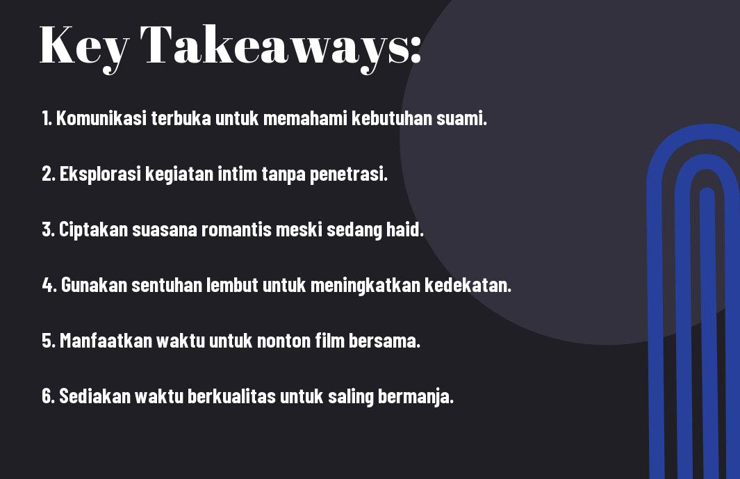 Menjaga keharmonisan dalam hubungan intim saat Anda sedang haid bisa menjadi tantangan, namun bukan berarti Anda tidak bisa memuaskan suami. Pertama-tama, penting untuk berkomunikasi dengan pasangan Anda. Jelaskan bagaimana perasaan Anda selama periode ini dan diskusikan cara-cara alternatif untuk tetap terhubung secara intim. Anda bisa mencoba aktivitas lain seperti pijat atau sentuhan yang lembut untuk menjaga kedekatan emosional. Disamping itu, cobalah juga untuk mengeksplorasi zona erotis lainnya, seperti bermain peran atau menggunakan mainan seksual yang dapat membantu menambah gairah tanpa harus melakukan hubungan seksual secara langsung.